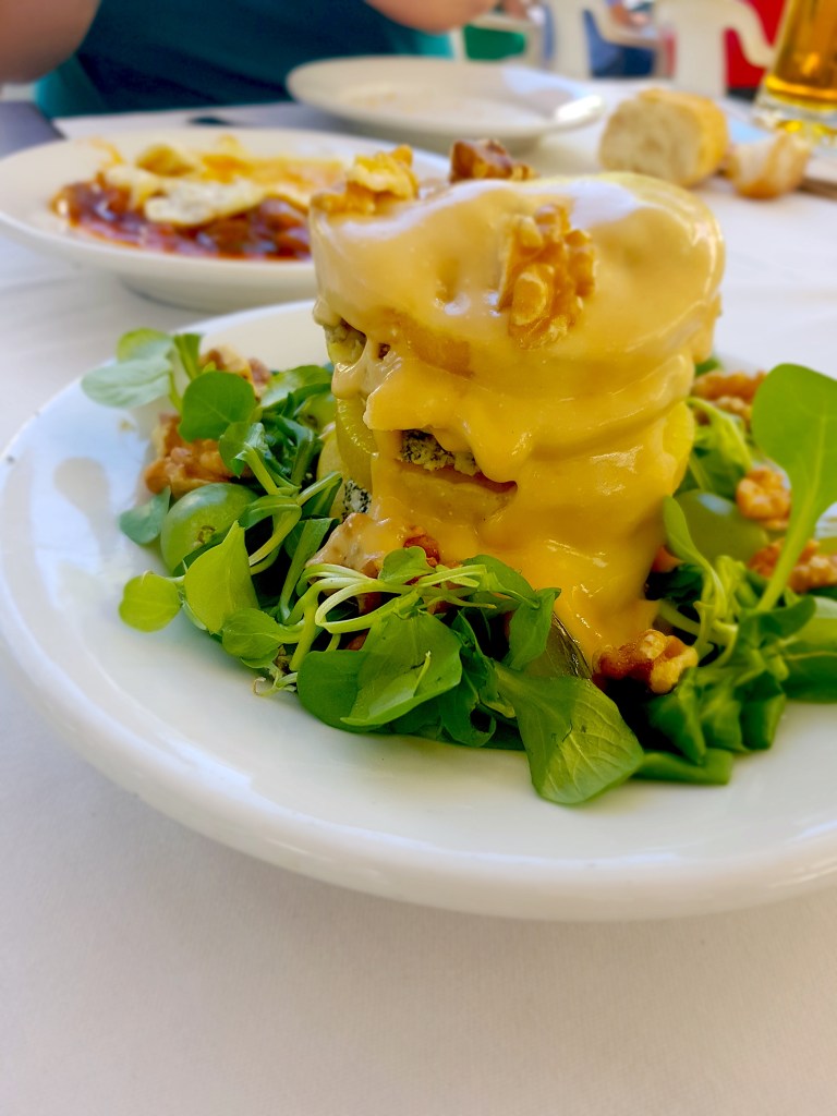 Yet the hands down discovery of the summer for me was the milhojas de manzana y cabrales con salsa de sidra, which is a layered, exquisite dish of apple and pineapple slices lathered with generous amounts of cabrales – a specialty blue cheese made with cow, sheep and goats milk that’s left to mature in a natural cave at a low temperature. This is a traditional Spanish cheese from the Asturias and Cantabria regions. The dish is then garnished with walnuts and grape slices, over a bed of canonigos (lamb’s lettuce).